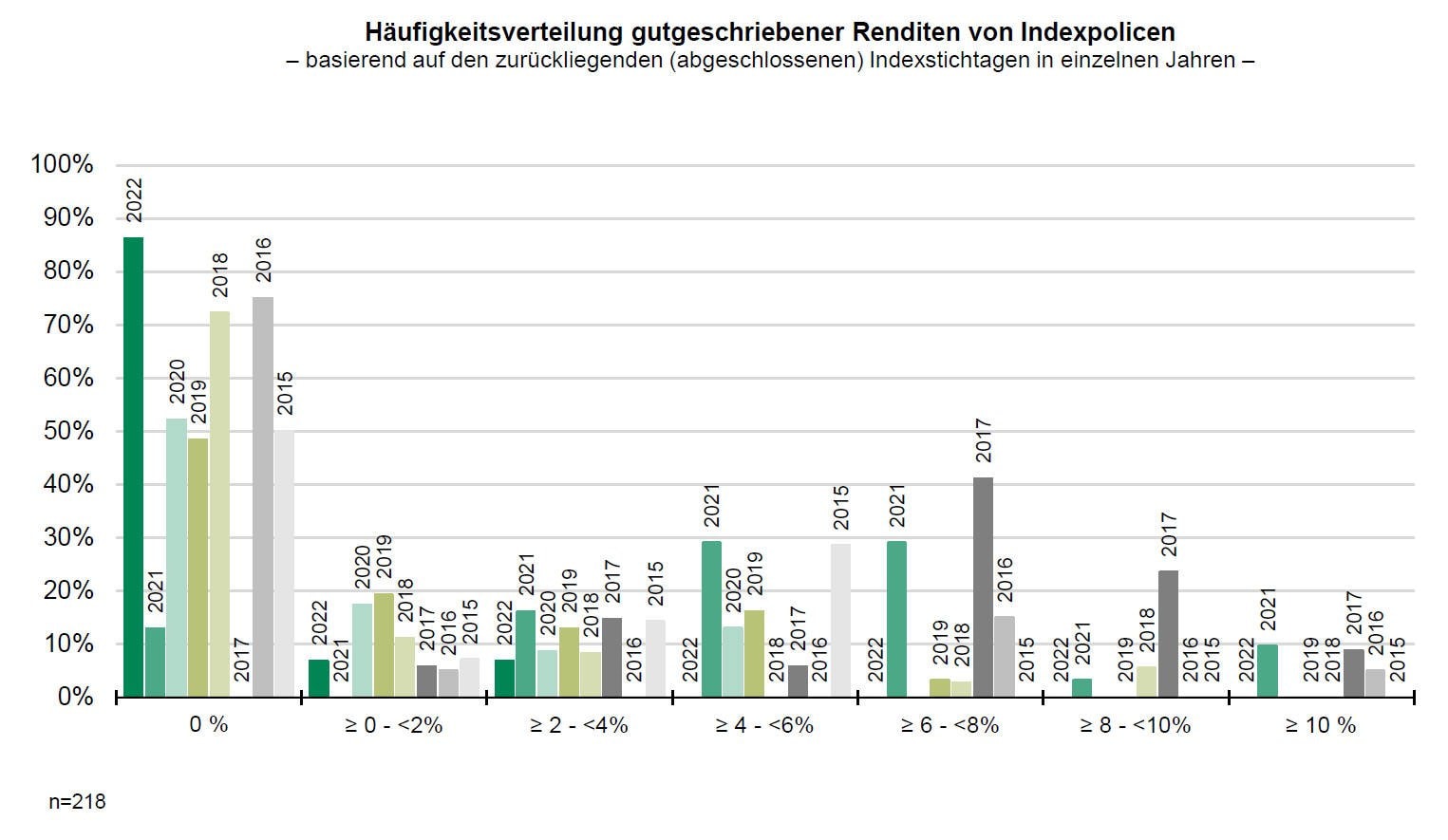 Obwohl das offenbar über anderen Produktkategorien liegt, stellt sich 2022 als dünnes Indexjahr heraus. Denn die Aktienmärkte liefen wegen des Dreiklangs aus Krieg, Inflation und Rezession schwach. Die meisten schlossen das Jahr mit einem Minus ab. In fast 90 Prozent der Fälle fiel für die Kunden von Indexpolicen somit keine Rendite an. Für Assekurata ist es das bislang schlechteste Indexjahr, seit es die Daten erhebt. Welche Renditen in den vergangenen Jahren anfielen, zeigt die folgende Grafik.