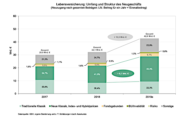 Diese Neuausrichtung zeige sich auch anhand des Branchenwachstums. Der Neuzugang der untersuchten Lebensversicherer habe 2019 im Vergleich zum Vorjahr um mehr als 10 Milliarden Euro zugelegt. 60 Prozent davon gehen laut Einschätzung der Assekurata-Analysten auf das Konto von Altersvorsorgeprodukten mit kapitaleffizienten Garantien, also auf die Neue Klassik, auf Indexprodukte und hybride Policen.
