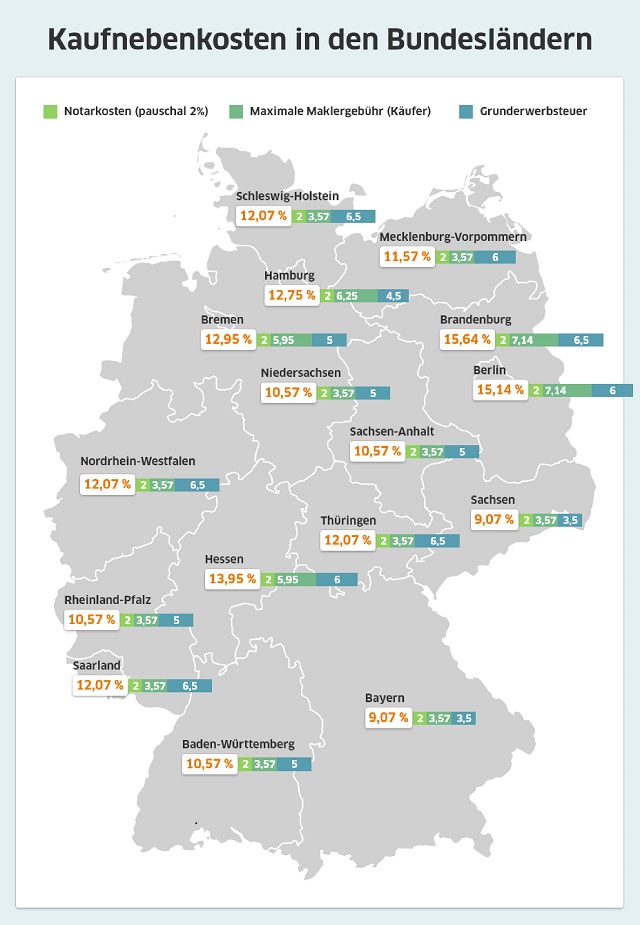 Die höchsten Nebenkosten zahlen laut Auswertung bislang Immobilienkäufer in Berlin und Brandenburg. Dort sind nicht nur die Maklerkosten, sondern auch die Sätze für die Grunderwerbsteuer mit 6 Prozent beziehungsweise 6,5 Prozent besonders hoch.