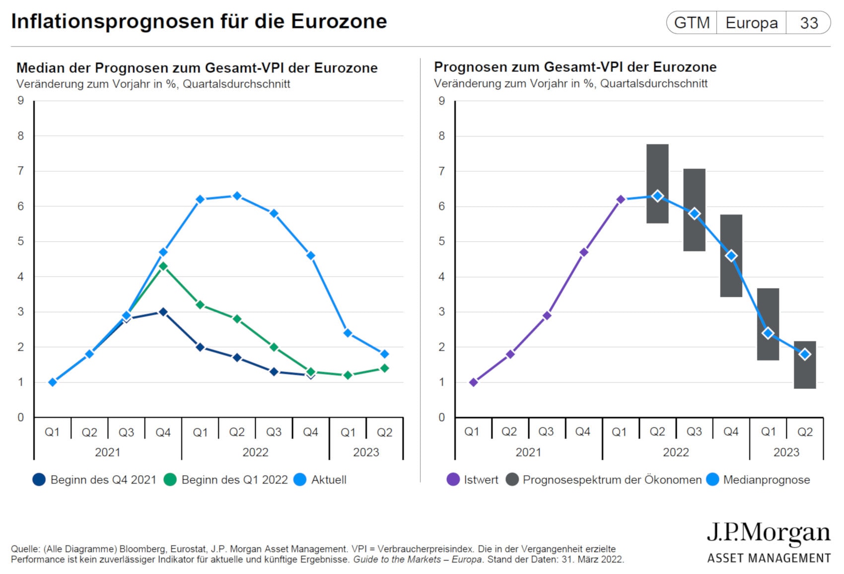 Geht es nach den Prognosen der Volkswirte, ist zumindest die Disinflation nicht weit. So geht es zumindest aus dem „Guide to the Markets“ hervor, den die Investmentfirma J.P. Morgan Asset Management (JPMAM) alle Vierteljahre veröffentlicht. Die aktuelle Ausgabe enthält Hoffnung für alle, die der Einkauf inzwischen ziemlich plagt.