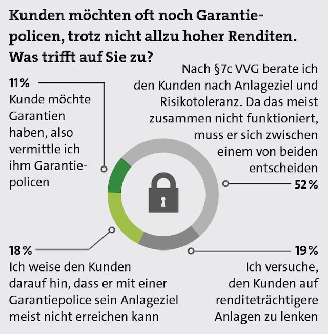 Lebensversicherungen und Garantien sind von jeher eng verwoben. In Zeiten „normaler“ Zinsen ließen sich Garantien gut abbilden und dennoch ansehnliche Erträge mit der Police erzielen. Das ist jetzt anders. Im Altersvorsorge-Gespräch stehen Berater daher häufig vor der Herausforderung, dass der Kunde gerne eine Police mit Garantie hätte, obwohl diese die mögliche Rendite stark belastet. Rund jeder zehnte Umfrageteilnehmer gibt dem Kunden, was er will, und vermittelt eine Garantiepolice. 18 Prozent weisen ihn darauf hin, dass er mit Garantie sein Anlageziel wohl nicht erreicht. Und etwa ebenso viele versuchen, den Kunden auf renditeträchtigere Policen zu beraten. Der Großteil der Befragten (52 Prozent) gibt an, gemäß des Paragrafen 7c des VVG zu beraten, nach dem sowohl Risikotoleranz als auch Anlageziel des Kunden zu beachten sind. Letztlich muss sich der Kunde dann entscheiden, was ihm wichtiger ist.