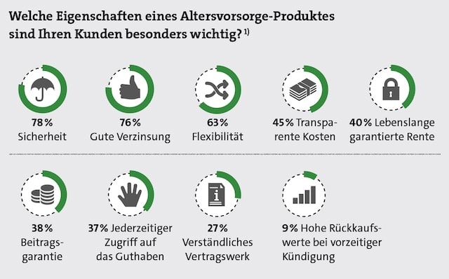 Diese Diskrepanz lässt sich vielleicht damit erklären, dass zwar nahezu 80 Prozent der Umfrageteilnehmer angeben, dass für ihre Kunden Sicherheit ein entscheidendes Merkmal eines attraktiven Altersvorsorgeprodukts ist. Fast ebenso viele nennen jedoch eine „gute Verzinsung“ als wichtiges Kriterium. Und Chancen auf eine gute Verzinsung bieten im Versicherungsbereich derzeit nun mal vor allem garantiefreie Fondspolicen. Eine Beitragsgarantie geben tatsächlich vergleichsweise niedrige 38 Prozent als wichtige Produkteigenschaft an. Höhere Priorität für die Kunden haben Flexibilität und transparente Kosten bei der Altersvorsorge.