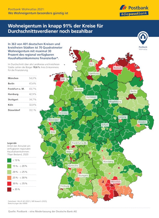 Welchen Anteil vom Einkommen verschlingen die Wohnkosten, also die Miet- oder die Kreditratenzahlungen? Das haben Experten des Hamburgischen Weltwirtschaftsinstituts (HWWI) für den Postbank Wohnatlas auf Basis der durchschnittlich regional verfügbaren Haushaltseinkommen errechnet. Dabei haben sie sich an der Faustformel orientiert, dass Wohnen nicht mehr als 30 Prozent des Haushaltseinkommens kosten sollte.