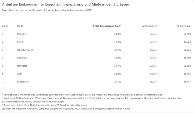 Der jeweilige Einkommensanteil für die Nettokaltmiete beziehungsweise für die Kreditraten wurde für eine 70-Quadratmeter-Wohnung berechnet. Für die Finanzierung einer Immobilie wurde ein Zinssatz von 2,45 Prozent, eine Anfangstilgung von vier Prozent und 20 Prozent Eigenkapital zugrunde gelegt.