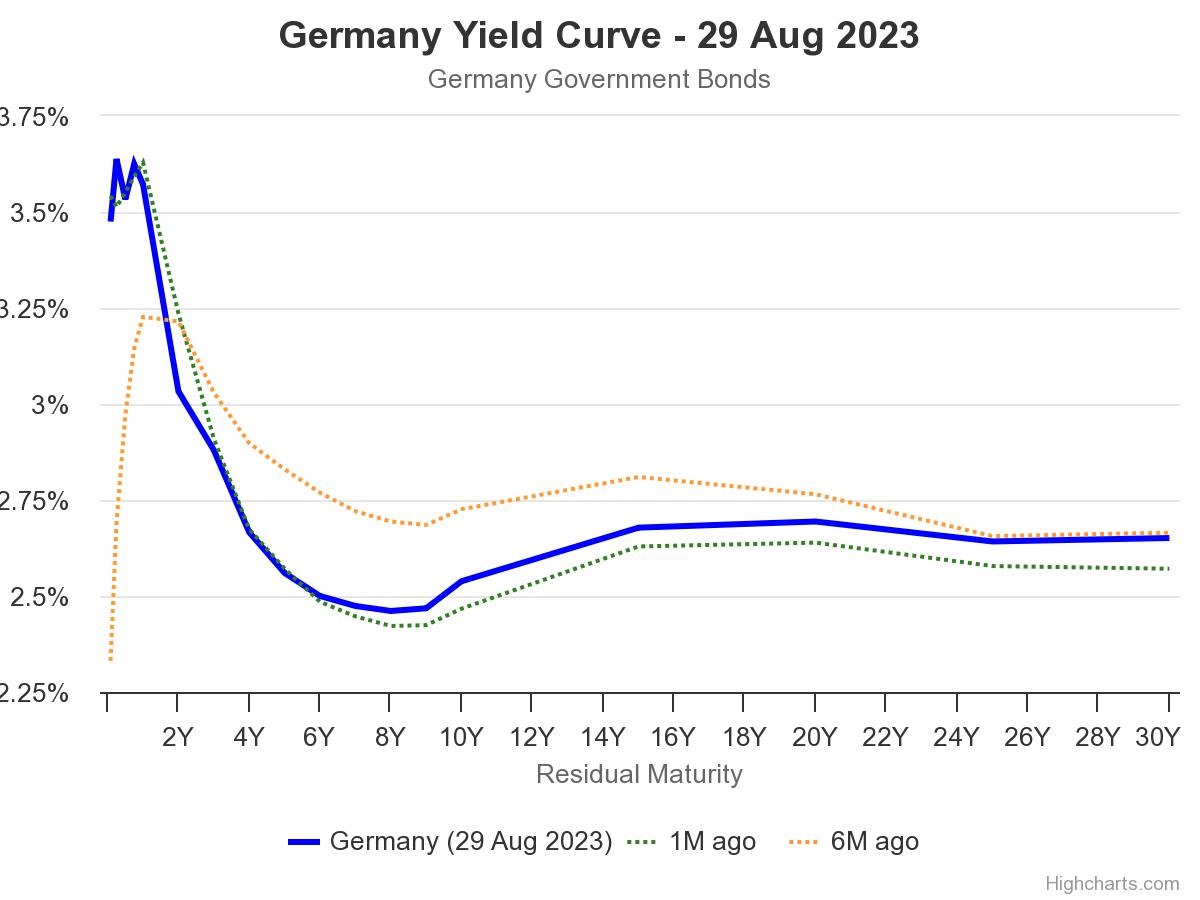 Und dort treffen wir derzeit auf ein eher seltenes Phänomen: die inverse Zinskurve – kurzlaufende Zinsen beziehungsweise Renditen liegen höher als lange. Die Rendite einer Bundesanleihe mit zehn Jahren Laufzeit beträgt derzeit 2,55 Prozent (Stand: 29. August 2023). Am kürzeren Ende, also zum Beispiel bei drei Monaten Laufzeit sind es 3,63 Prozent. Und der Leitzins der EZB liegt gar bei 4,25 Prozent. Doch solche Missverhältnisse hatte noch nie lange Bestand (überhaupt nur einmal über ein Jahr lang). Schon weil sie dem Grundgedanken der Wirtschaft widersprechen. Heißt also: Entweder sinken die Renditen am kurzen Ende stark, oder sie steigen am langen Ende.