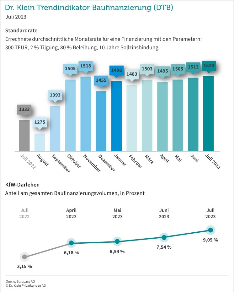 Wenn am kurzen Ende die Zinsen sinken, hätte sich die Zinskurve wieder normalisiert, und die Bauzinsen könnten dort bleiben, wo sie sind. Einigermaßen beruhigt hat sich die Angelegenheit ja schon. Die zehnjährigen Immo-Zinsen pendeln laut Interhyp seit Oktober 2022 recht stabil zwischen 3,5 und 4,0 Prozent. Konkurrent Dr. Klein berechnet und meldet regelmäßig eine sogenannte Standardrate für Immobilienkredite. Sie hatte im Oktober 2022 ein hohes Niveau erreicht, tritt seitdem aber mit nur noch leichten Schwankungen auf der Stelle. Für Juli meldete die Bundesbank neu vergebene Baukredite von insgesamt 14,0 Milliarden Euro. Im Mai waren es noch 13,7 und im April 13,0 Milliarden Euro. Gleichgewicht gefunden? Es sieht erstmal so aus.