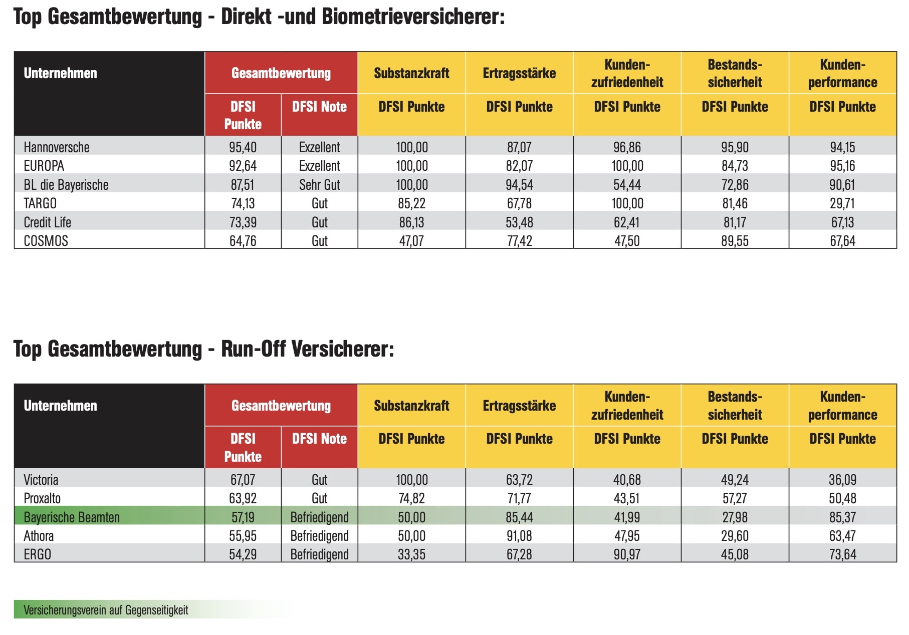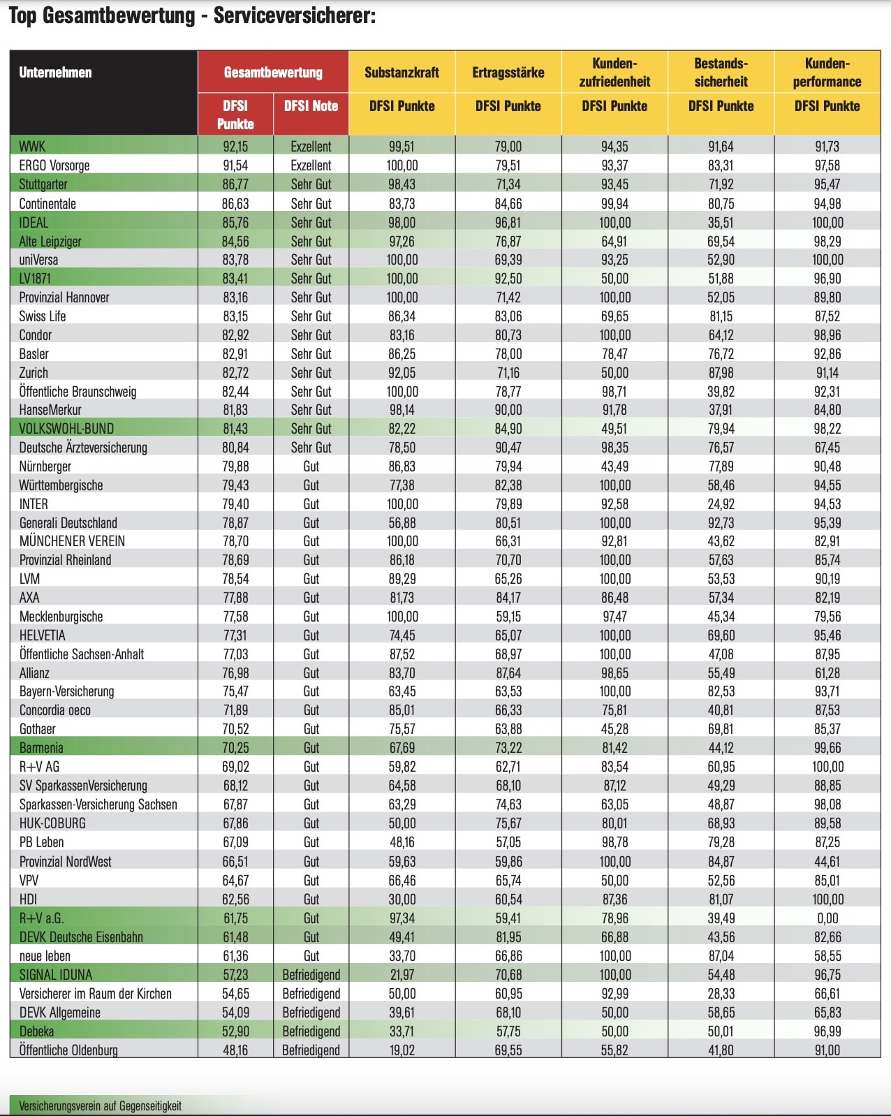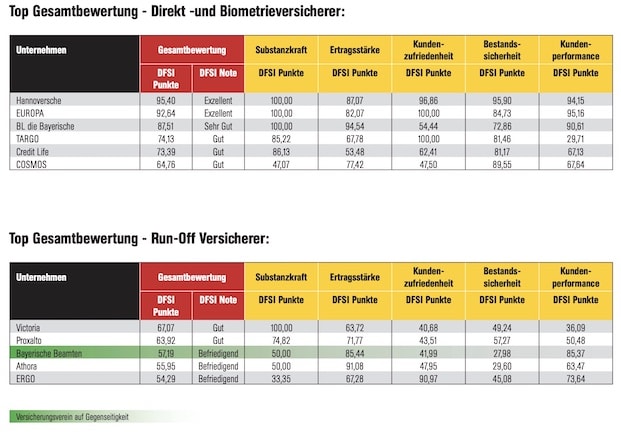 Mit der Note „Sehr Gut“ wurden fünfzehn Service-Versicherer sowie ein Biometrie-Versicherer bedacht. Die Note „Gut“ erhielten insgesamt 32 Versicherer, darunter auch Marktführer Allianz. Acht Versicherer boten in Sachen Zukunftssicherheit laut DFSI dagegen nur eine „befriedigende“ Gesamtleistung.