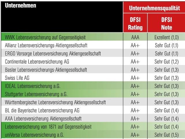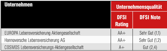 Bei den drei Direktversicherern schnitt die Europa mit „Sehr gut (1,1)“ am besten ab, die Hannoversche bekam die Note „Sehr Gut (1,2)“. Die Cosmos Lebensversicherung kam im DFSI-Qualitätsrating auf „Gut (2,4)“.