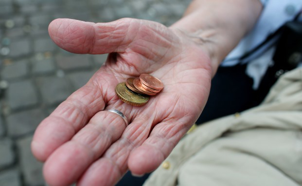 Eine Rentnerin hält ein paar Münzen in der Hand.