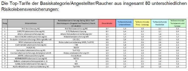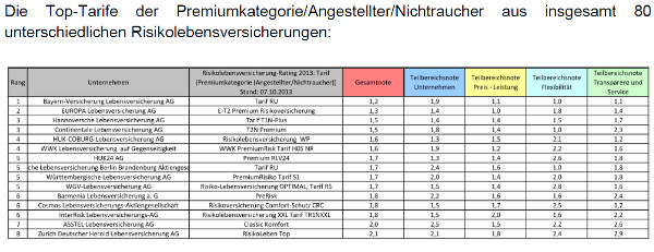 Hier ist die Tabelle mit den besten Versicherern für einen angestellten Nichtraucher, einmal im Basistarif: