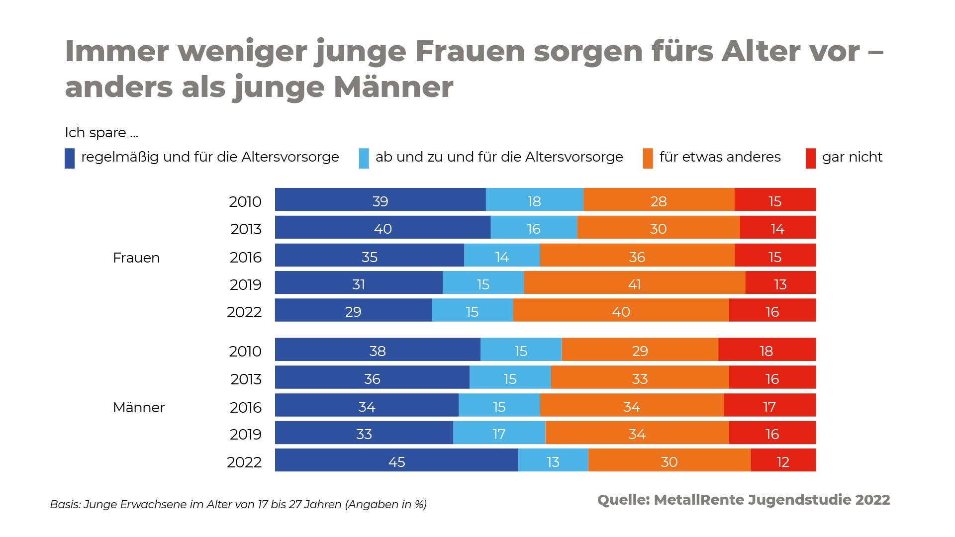Und hier zeigt sich, dass sich die Schere zwischen den Geschlechtern künftig noch weiter zu öffnen droht: Denn nur noch 29 Prozent der jungen Frauen zwischen 17 und 27 Jahren sparen regelmäßig für ihr Alter, wie die Studie ergab. Zum Vergleich: Im Jahr 2010 taten dies immerhin noch 39 Prozent. Während junge Frauen also immer weniger regelmäßig vorsorgen, haben junge Männer ihre Anstrengungen im gleichen Zeitraum deutlich erhöht: Statt 38 Prozent legen heute 45 Prozent regelmäßig Geld für ihren Ruhestand beiseite (siehe erste Grafik).