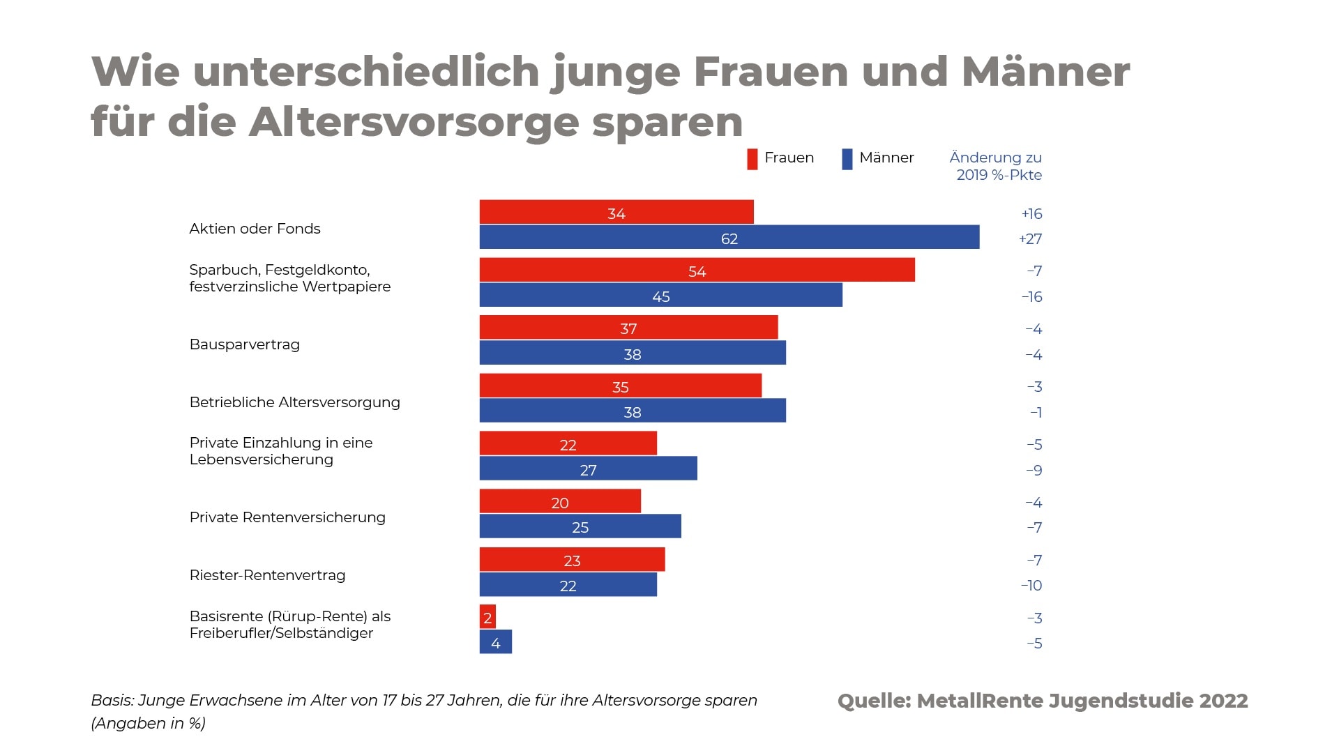 Größere Unterschiede zwischen den Geschlechtern treten wieder zu Tage, wenn es um die Art der Vorsorge geht – allen voran beim Aktiensparen: Zwischen 2016 und 2022 hat sich der Gesamtanteil derjenigen verdreifacht, die aktien- und fondsbasiert für ihre Rente sparen – von 16 auf 50 Prozent, allerdings nur gesamtgeschlechtlich gesehen. Denn während bei den jungen Männern bereits 62 Prozent auch auf Aktien und Fonds setzen, sind es bei den jungen Frauen lediglich 34 Prozent. Immerhin ist dieser Wert im Vergleich zur letzten Erhebung im Jahr 2019 stark angestiegen von damals 18 Prozent.