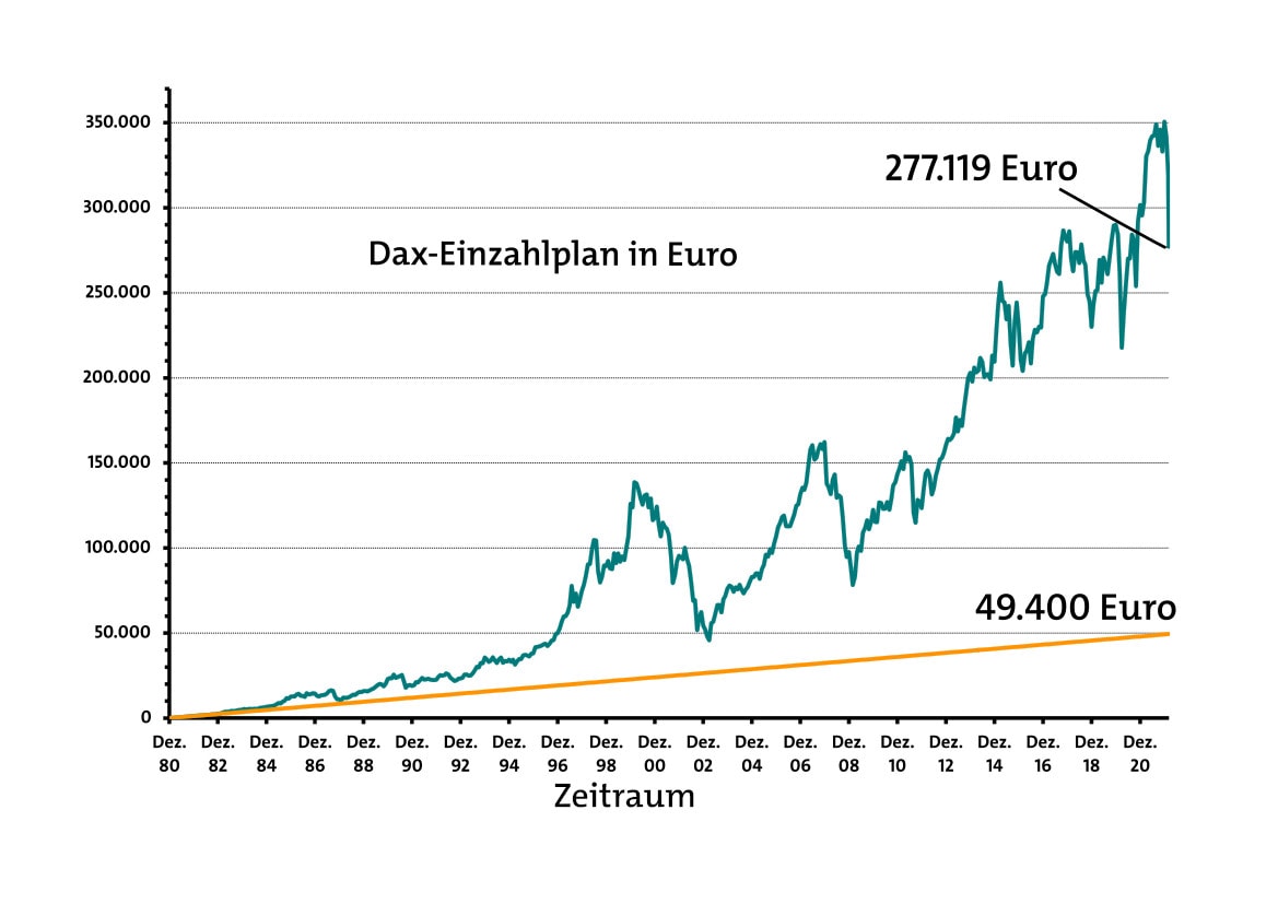 Nehmen wir nun an, jemand beginnt 1981 mit monatlich 100 Euro (also damals 195,58 Mark) zu sparen. Das macht bis Ende Februar 49.400 eingezahlte Euro. Mithilfe des Dax wären daraus bis heute um 10 Uhr 277.119 Euro geworden. Das sähe so aus: