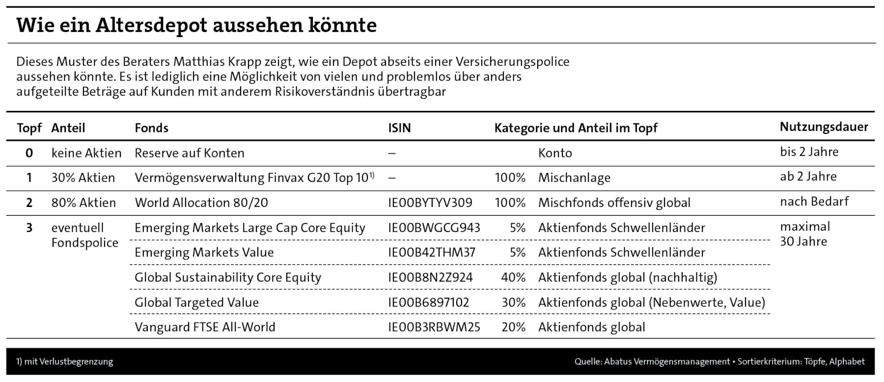 Solche Kunden berät beispielsweise Matthias Krapp, Geschäftsführer der Abatus Vermögensmanagement in Dinklage. „Sie haben so gut ausgesorgt, dass das Langlebigkeitsrisiko bei ihnen nicht vorhanden ist. Sie brauchen deshalb keine lebenslange Rente, sondern regelmäßige oder flexible Zuschüsse.“