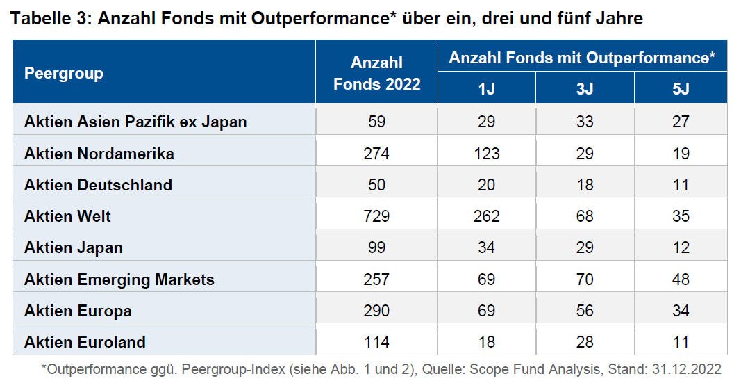 Im abgelaufenen Jahr hat fast ein Drittel der aktiv gemanagten Aktienfonds aus wichtigen Vergleichsgruppen den entsprechenden Marktindex geschlagen. Das berichtet das Analysehaus Scope Fund Analysis im Rahmen der Studie „Aktiv versus Passiv 2022“.