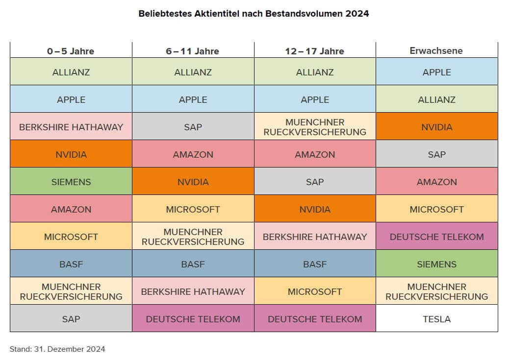 Die richtig große Überraschung bringt allerdings die Erkenntnis mit sich, welche Einzelaktien in den Kinderdepots besonders häufig auftaucht. Es ist nämlich kein einziger der einschlägigen, fantastischen Tech-Top-Titel aus den USA, sondern: die Allianz. In allen drei Altersgruppen.