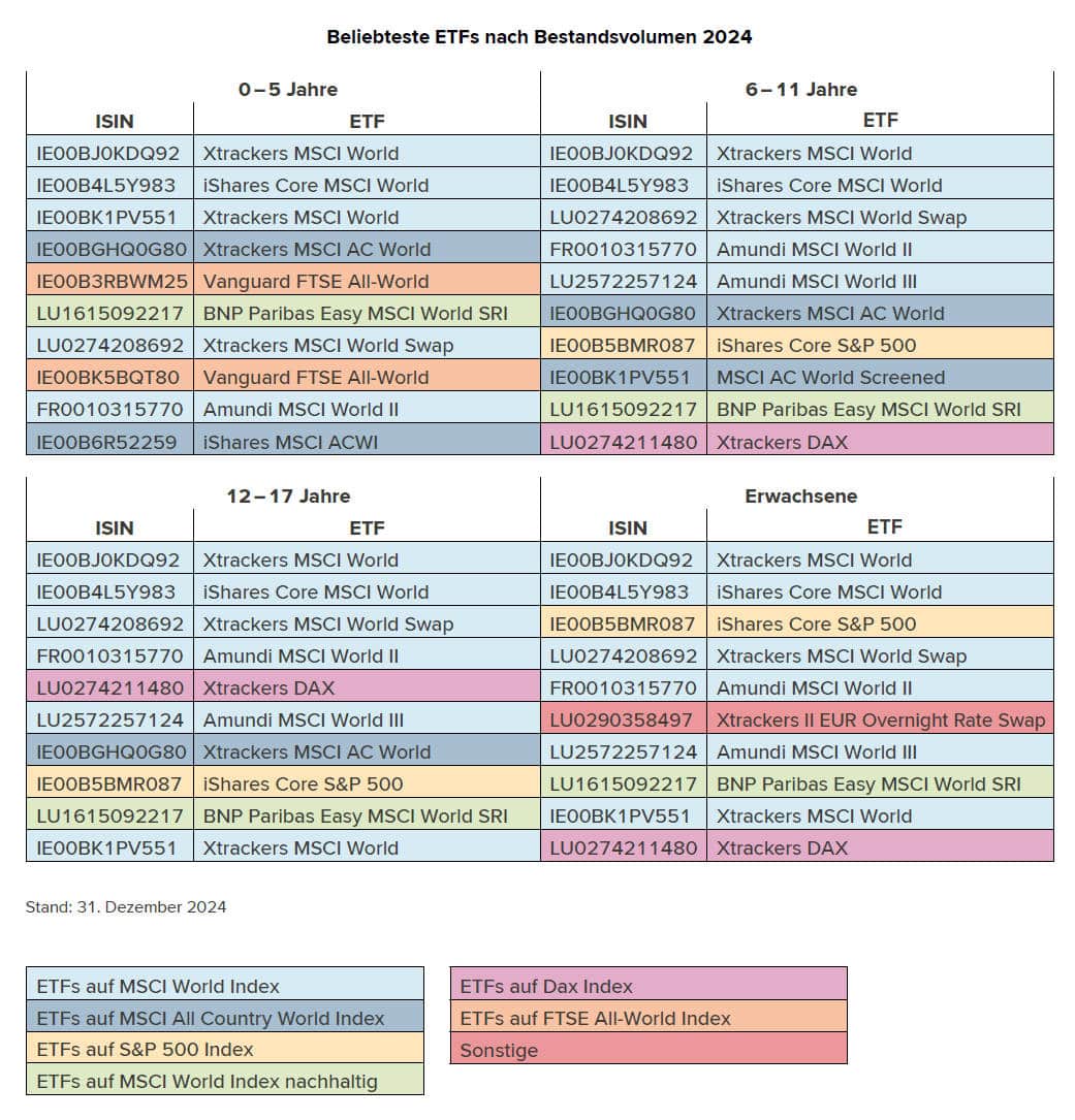 Womit wir zur Frage kommen, in welche konkreten ETFs die Junioren ihr Geld liegen haben. In diesem Punkt bestimmt der Aktienindex MSCI World das Geschehen. Der Xtrackers MSCI World ETF (ISIN: IE00BJ0KDQ92) liegt in allen Altersgruppen (auch bei den Erwachsenen) im Bestandsvolumen ganz vorn. Und das, obwohl der Aktienindex im laufenden Jahr enorm in die Kritik geraten war und es gute Alternativen gibt.
