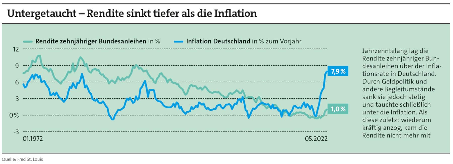 Ertrag aus Bundesanleihen im Vergleich zur Inflation in Deutschland (Quellen: Bundesbank, Fred St. Louis)