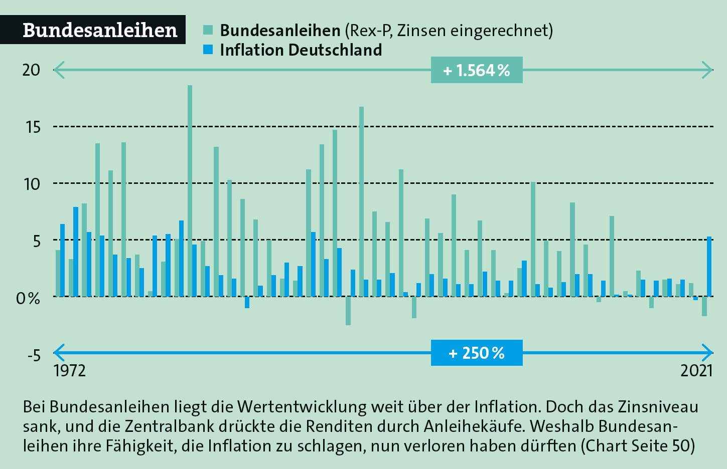 Anleihen gehören zu den Nominalwerten. Schuldner geben sie in bestimmten Geldbeträgen heraus, verzinsen sie und zahlen sie am Ende zu einem festgelegten Wert zurück. Und jahrelang war es tatsächlich einfach, mit Bundesanleihen die Inflation zu übertreffen. Die folgende Grafik zeigt, wie das ausgesehen hätte. Eingezeichnet sind die jährlich erzielten Erträge, gemessen am Bundesanleihe-Index Rex-P. Damit sind also sowohl Kurse als auch Zinsen enthalten.