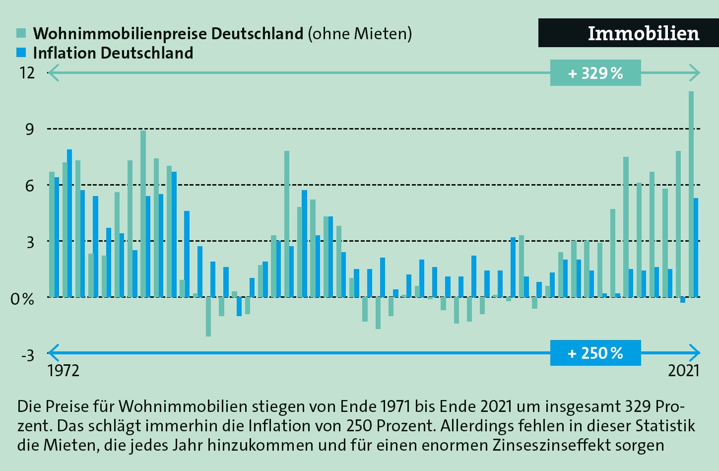 Wenn es darum geht, sich vor Inflation zu schützen, geht es meistens auch um Sachwerte. Und dann fällt stets im selben Atemzug mit Aktien auch das gute alte Betongold als Sachwert schlechthin. In der Tat übertrafen die Preise für Wohnungen in den vergangenen 50 Jahren die Inflation in Deutschland, wie die folgende Grafik zeigt. Und das ist nicht einmal alles, denn zu den gestiegenen Preisen gesellen sich noch Mieteinnahmen hinzu.