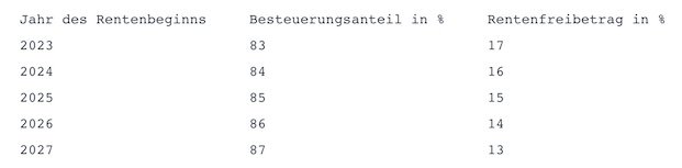 Dazu gibt die Vereinigte Lohnsteuerhilfe einen Überblick über die Entwicklung des Rentenfreibetrags in den kommenden Jahren: