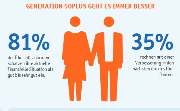 Zwei drittel (67 Prozent) der Über-50-Jährigen planen zudem in die eigenen vier Wände zu investieren – das sind deutlich mehr als im Vorjahr und zugleich zehn Prozentpunkte mehr als bei den Jüngeren.