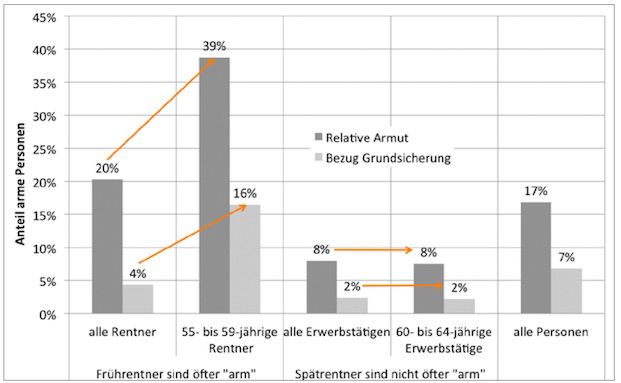 Die Studie zeigt, dass von Armut Bedrohte nicht nur überdurchschnittlich häufig in Frührente gingen, sondern im Laufe des Erwerbslebens auch überdurchschnittlich lange arbeitslos waren.