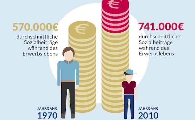 Was würde das für die jüngeren Generationen konkret bedeuten? Auch das hat die Bertelsmann Stiftung ausgerechnet. Ein im Jahr 2010 geborener Durchschnittsverdiener müsste im Vergleich zu einem 1970 Geborenen mit identischem Brutto-Lebenseinkommen im Verlauf seines Erwerbslebens rund 171.000 Euro mehr Sozialbeiträge zahlen, um die gleichen Leistungen zu beziehen. Die gesamten Sozialbeiträge eines Erwerbslebens würden damit von durchschnittlich rund 570.000 Euro (Jahrgang 1970) auf 741.000 Euro (Jahrgang 2010) steigen.