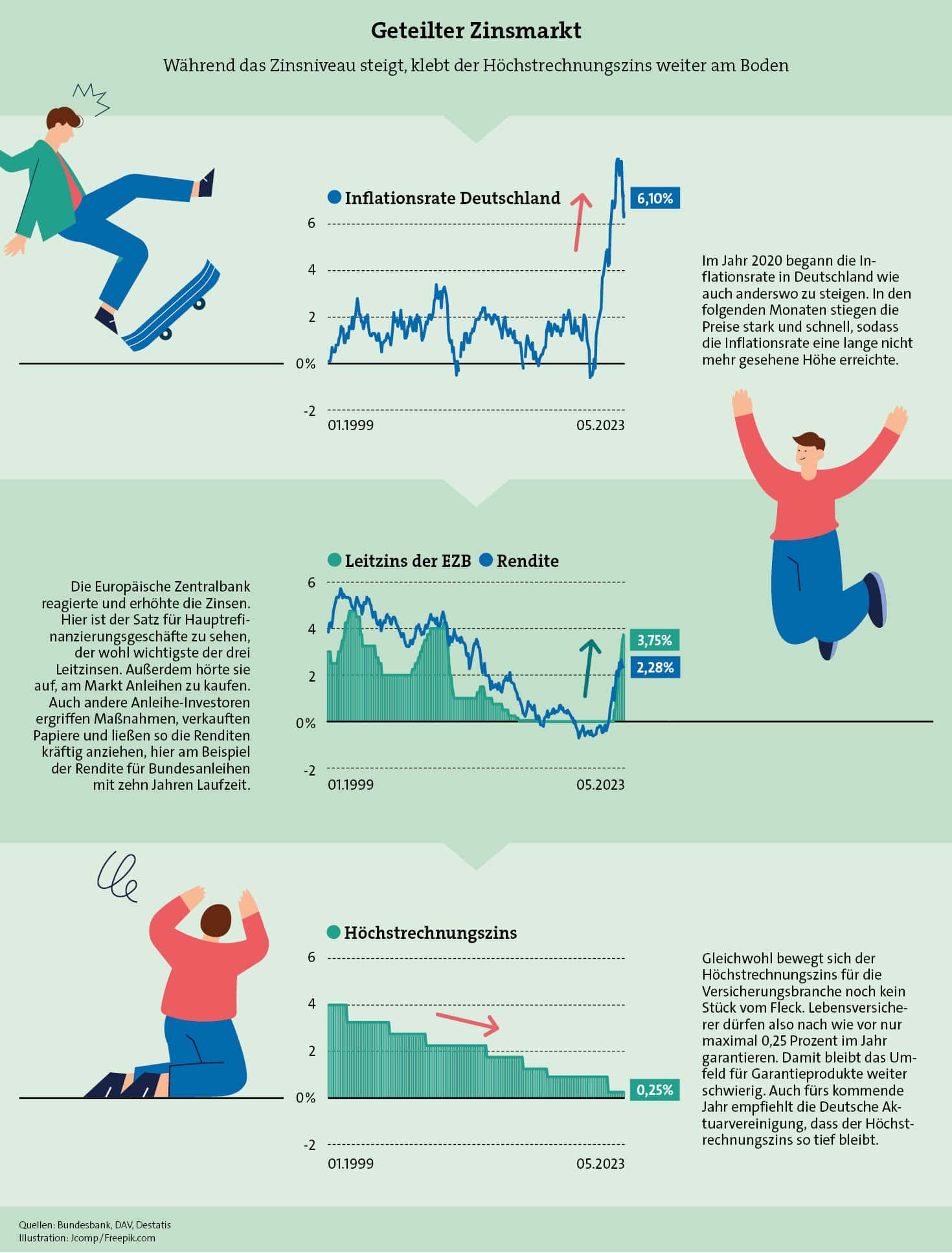 Damit bleibt trotzdem die Frage im Raum, ob nun nach der Zinswende nicht doch der Umkehrschluss eintritt – nämlich, dass Garantien jetzt wieder steigen. Leider muss Michael Hauer in dieser Hinsicht die Pferde gleich wieder beruhigen. Nach einer abnormalen Zinsphase unter dem Nullpunkt seien wir jetzt lediglich in einer normalen Zinsphase angekommen, meint der Chef des Instituts für Vorsorge und Finanzplanung (IVFP). Wobei das vielleicht noch kein Problem ist – auch normale Zinsen sind mehr als nichts. Dann kommt aber das große Aber: „Zur Erzeugung der Garantien ist derjenige Zinssatz entscheidend, den der Versicherer dem Kunden garantiert. Das ist in der Regel maximal der gesetzlich vorgeschriebene Rechnungszins“, so Hauer.