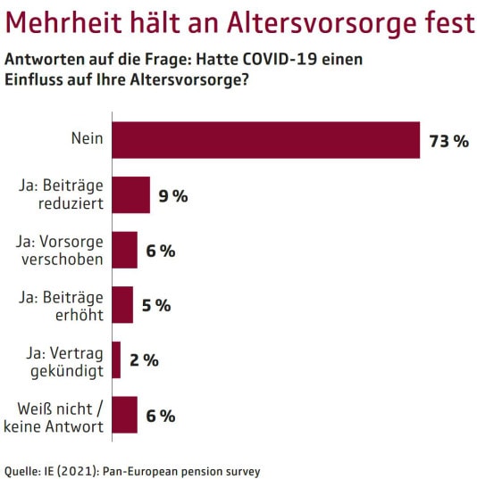 Bei mehr als 70 Prozent der Europäerinnen und Europäer hatte die Corona-Pandemie mit all ihren wirtschaftlichen Nebenwirkungen keinen negativen Einfluss auf die eigene Altersvorsorge. Das geht aus einer Umfrage des europäischen Versichererverbands Insurance Europe vom Sommer 2021 hervor. An der Umfrage beteiligten sich rund 16.800 Menschen von 18 bis 70 Jahren aus 16 Ländern.
