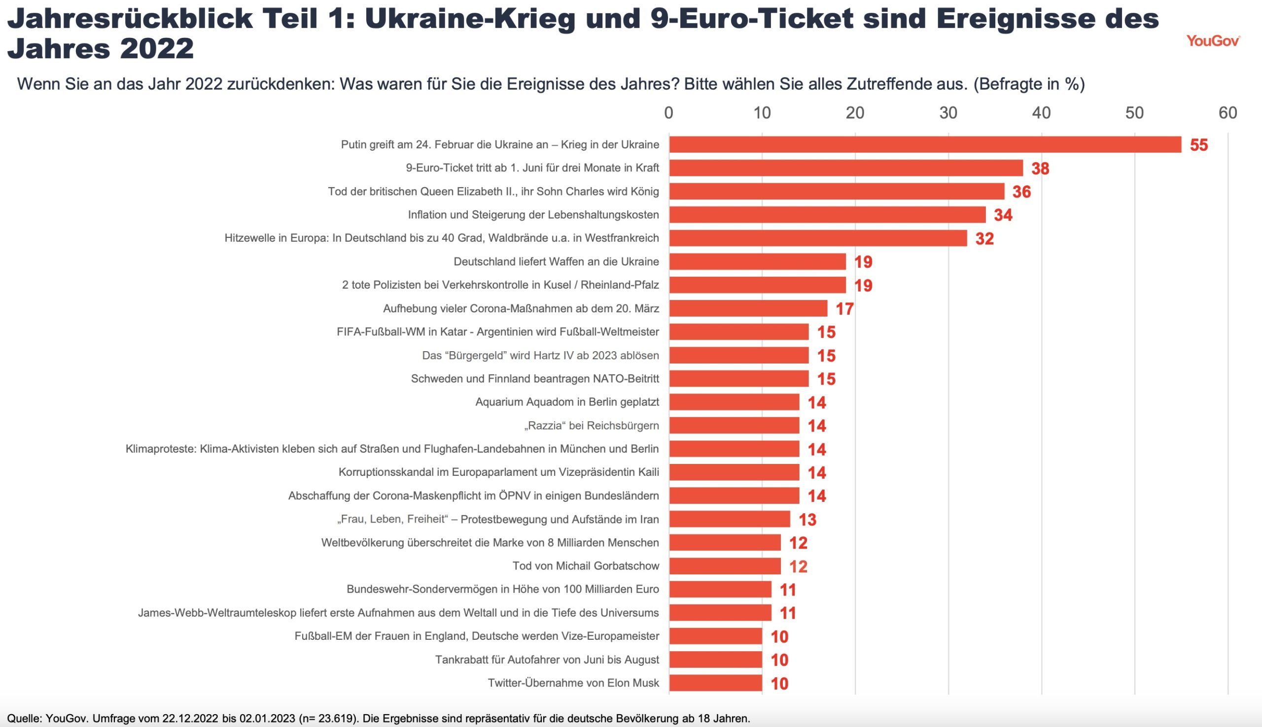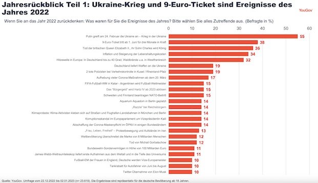 Außerdem wollte das Umfragen-Institut wissen, welche Ereignisse den Menschen hierzulande besonders in Erinnerung geblieben sind – hier zeigt sich ein klares Bild: Der Angriff Russlands auf die Ukraine am 24. Februar 2022 und der daraus resultierende Krieg markierte für die meisten Befragten das „Ereignis des Jahres“: Von insgesamt 44 abgefragten Ereignissen wurde der Ukraine-Krieg am häufigsten genannt (55 Prozent, siehe Grafik). Mit etwas größerem Abstand folgt für die Gesamtheit der Deutschen das 9-Euro-Ticket im deutschen Nahverkehr (38 Prozent), welches man von Juni bis August 2022 monatlich erwerben konnte. „Dies war vor allem für die 18- bis 24-Jährigen bedeutsam (50 Prozent) und für diese Altersgruppe von allen abgefragten Ereignissen das am häufigsten genannte“, wie die Autoren der Studie berichten.