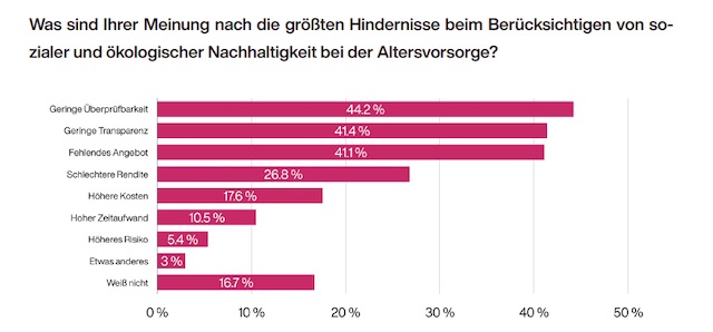 Zum anderen fehlt es an passenden Angeboten. 41 Prozent der Bürgerinnen und Bürger sehen das fehlende Angebot als ein wesentliches Hindernis an, soziale und ökologische Nachhaltigkeitskriterien bei der Wahl der Altersvorsorge zu berücksichtigen.