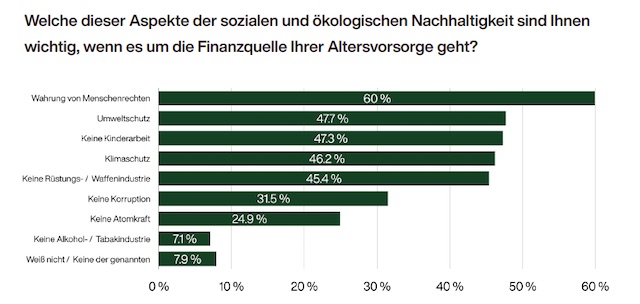 Insbesondere die Wahrung von Menschenrechten (60 Prozent) und der Klima- und Umweltschutz (48 Prozent) spielen eine bedeutende Rolle. Das hat eine repräsentative Umfrage im Auftrag des Altersvorsorge-Start-ups Vantik ergeben. Dafür hatte der Marktforscher Civey vom 7. bis 13. Mai 8.604 Bürgerinnen und Bürger befragt.