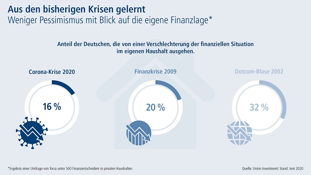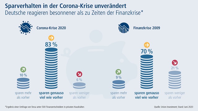 Mit 83 Prozent will die große Mehrheit der Deutschen ihr Sparverhalten aufgrund der Corona-Krise nicht auf den Prüfstand stellen. Das geht aus dem aktuellen Anlegerbarometer der Fondsgesellschaft Union Investment hervor – einer repräsentativen Befragung von 500 Finanzentscheidern zwischen 20 und 59 Jahren, die mindestens eine Geldanlage besitzen. 10 Prozent der Befragten wollen jetzt mehr sparen, nur 6 Prozent geben an, nun weniger Geld zurücklegen zu wollen. Dabei machen sich 70 Prozent der Anleger keine Sorgen um die Sicherheit ihrer Geldanlagen. Nur einer von zehn Befragten denke darüber nach, eine andere Anlageform zu wählen.