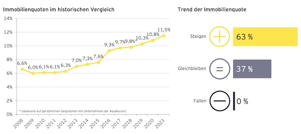 Demnach wollen 63 Prozent der befragten Versicherungsunternehmen ihre Immobilienquote weiter steigern. Die verbleibenden 37 wollen sie konstant halten. Eine Trendumkehr sei bei der seit nunmehr zehn Jahren steigenden Immobilienquote nicht festzustellen (siehe Grafik).