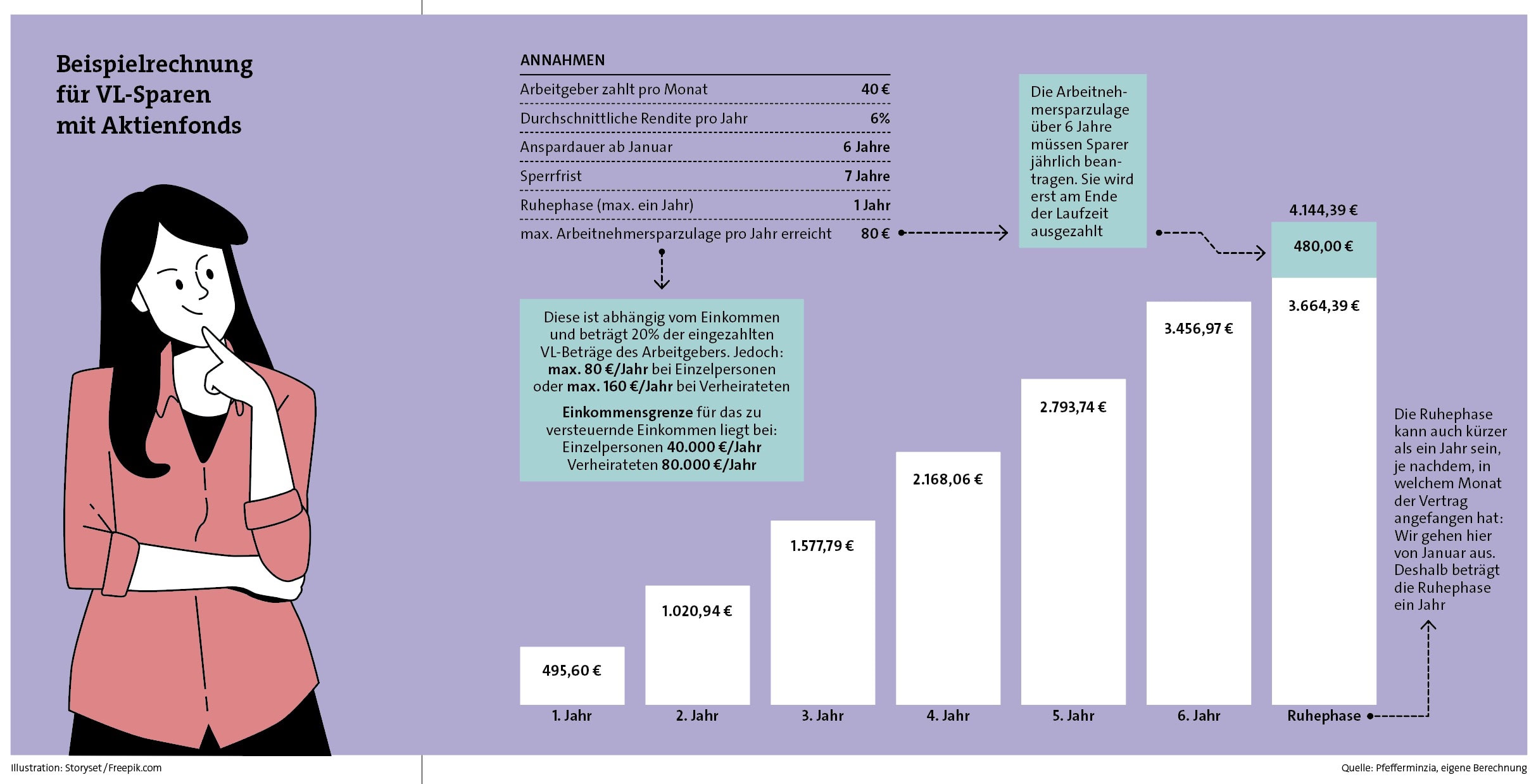 Teilzeitangestellte erhalten die VL anteilig. Zur Auswahl stehen verschiedene Anlageformen – etwa Banksparpläne, Bausparverträge, Tilgung laufender Baukredite oder Aktienfonds. Besonders attraktiv wird das Modell durch die staatliche Arbeitnehmersparzulage. Diese ist einkommensabhängig und variiert je nach Anlageform. Was nach sieben Jahren aus VL als Sparbetrag resultieren kann, erfahren Sie im rechten Kasten.