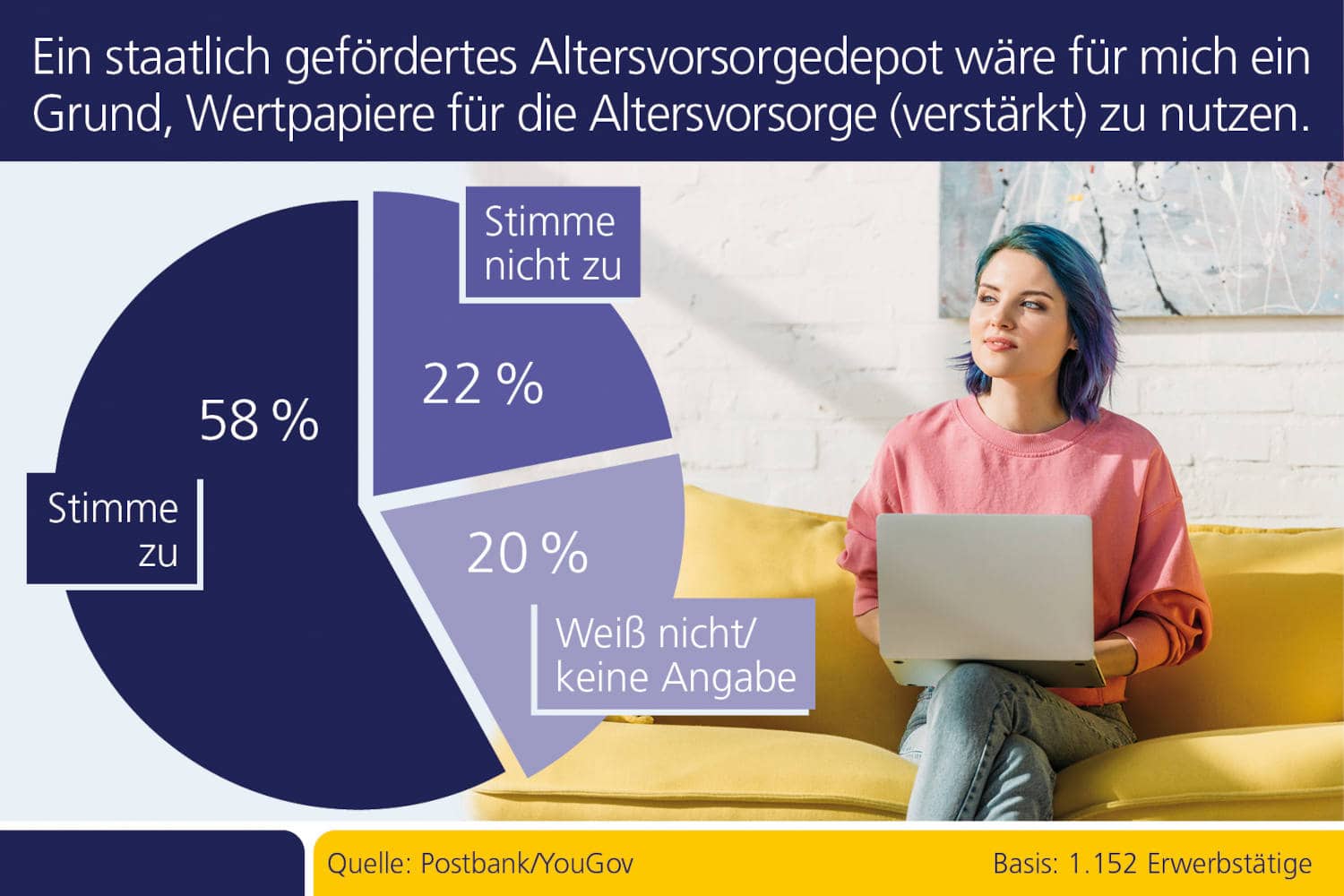 Das von der Regierung geplante, staatlich geförderte Depot für die private Altersvorsorge (das Altersvorsorgedepot) stößt bei den Menschen in Deutschland auf Gegenliebe. Sogar Anleger, die bislang keine Wertpapiere nutzen, interessieren sich durch das Altersvorsorgedepot verstärkt für Aktien oder Investmentfonds. Das geht aus einer Yougov-Umfrage im Auftrag der Postbank hervor. Dafür ließ sie 2.248 Personen ab 18 Jahren repräsentativ befragen, 1.152 davon sind erwerbstätig.