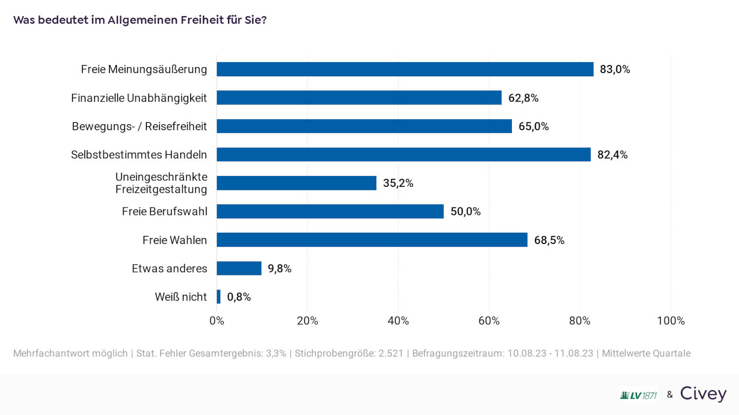 Und wenn wir das Thema Geld einmal beiseite lassen – was verstehen die Menschen dann unter Freiheit? Dort gibt es zwei Favoriten: 83,0 Prozent wollen ihre Meinung frei äußern dürfen, und 82,4 Prozent wollen tun und lassen können, was sie wollen. Weitere 68,5 Prozent verstehen darunter freie Wahlen. Die weiteren Ergebnisse zeigt wieder die Grafik: