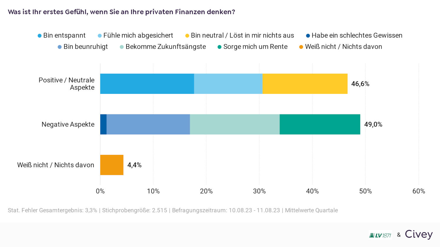 Demnach fühlen sich insgesamt 46,6 Prozent der Befragten entweder entspannt oder abgesichert oder mindestens neutral, wenn sie an ihr eigenes Geld denken. Im Vorjahr waren das in Summe nur 36,9 Prozent. Wie sich die Einzelmeinungen verteilen, zeigt die folgende Grafik: