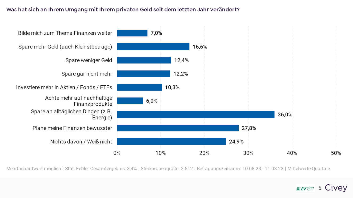 Daraus ergibt sich folgende Frage: Sparen die Menschen mehr, weil sich die Lage entspannt hat? Oder hat sich die Lage entspannt, weil sie mehr sparen? Schwer zu sagen. Gut zu sehen ist allerdings, dass bei der Frage, wie sich der Umgang mit Geld verändert hat, die Vorsicht zugenommen hat. Nach 34,5 Prozent im Vorjahr sparen nun 36,0 Prozent an den alltäglichen Dingen. 10,3 Prozent stecken ihr Geld verstärkt in Aktien oder Aktienfonds, was auch ETFs mit einschließt (Vorjahr: 7,6 Prozent). 27,8 Prozent (26,5 Prozent) planen ihre Finanzen bewusster. Und das generelle Sparaufkommen ist ebenfalls gestiegen.