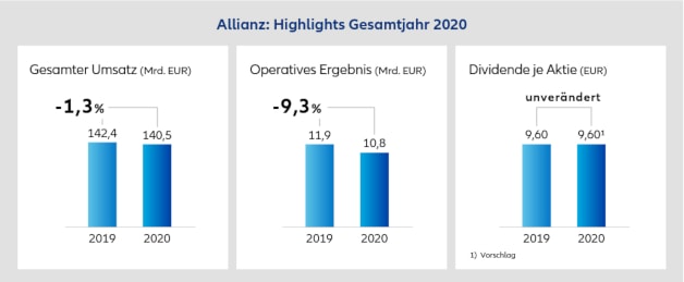 Betriebsschließungen, abgesagte Großveranstaltungen und anhaltend niedrige Zinsen: Die Corona-Pandemie ist auch an der Allianz nicht spurlos vorübergegangen. Das zeigen die Geschäftszahlen für das Jahr 2020, die der Münchener Konzern jetzt vorlegte. Danach sank der operative Gewinn im vergangenen Jahr um 9,3 Prozent auf 10,8 Milliarden Euro (2019: 11,9 Milliarden). Die „negativen Auswirkungen von Covid-19“ an diesem Ergebnis belaufen sich nach Unternehmensangaben auf 1,3 Milliarden Euro.