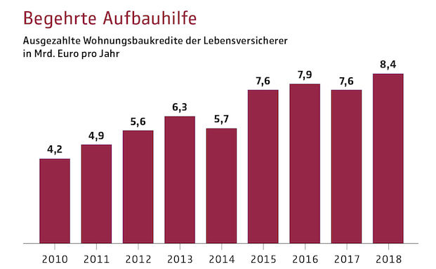 Das Geschäft mit Wohnungsbaukrediten läuft für die deutschen Lebensversicherer derzeit sehr gut. Wie der Branchenverband GDV berichtet, haben die Anbieter im Jahr 2018 einen neuen Rekordwert erreicht: Das Volumen der ausgezahlten Immobiliendarlehen legte um fast 12 Prozent auf 8,4 Milliarden Euro zu.
