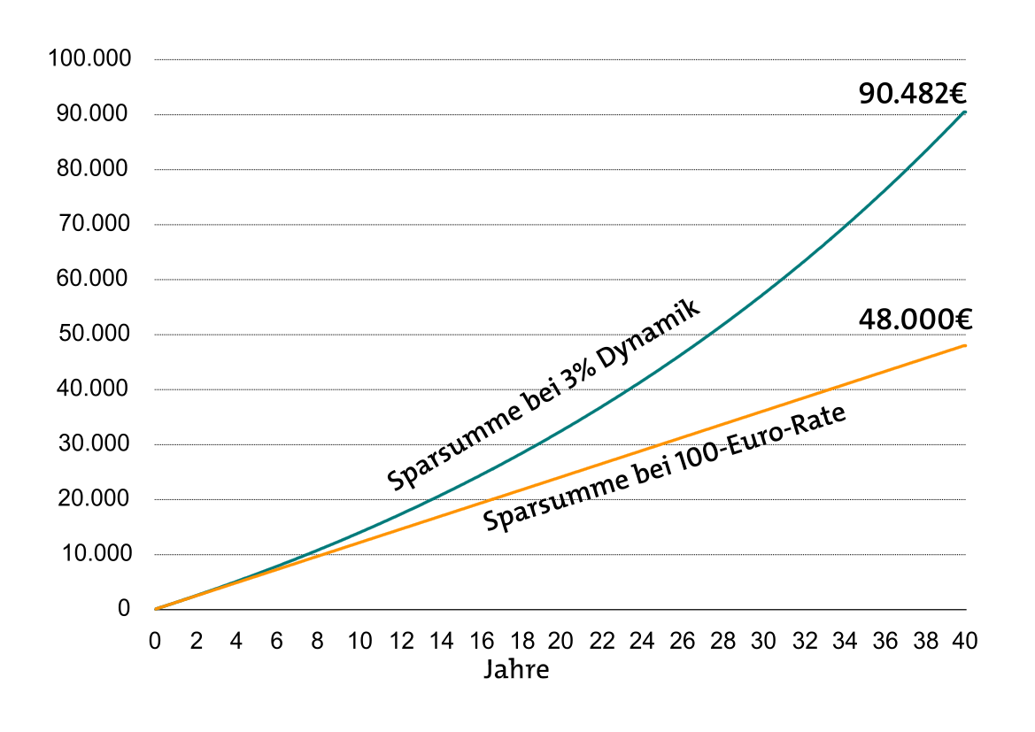 Die Grafik zeigt die Sparsummen mit und ohne Dynamik:
