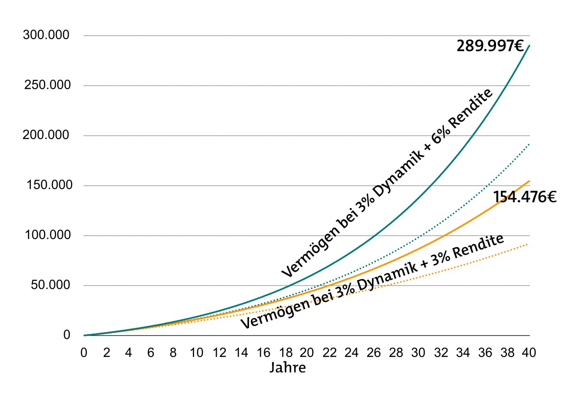 Seite 2: Wie sich Sparvermögen mit Dynamik und 3 beziehungsweise 6 Prozent Rendite entwickelt
