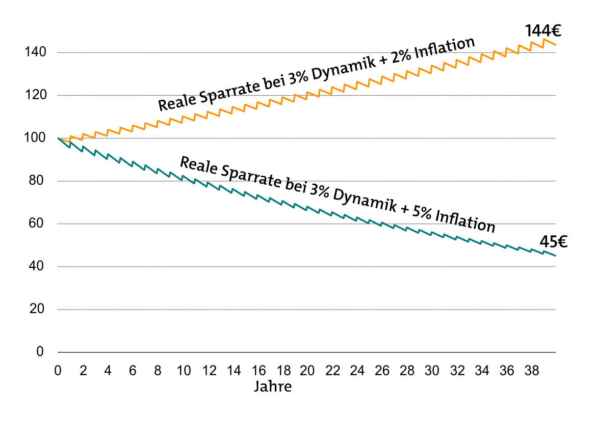 Damit zeigt die Grafik, dass die echte Sparbelastung nach Inflation trotz Dynamik kaum steigt. Die Sägezähne sind unserem stark vereinfachten Modell geschuldet. Sie entstehen, weil der Beitrag zu Jahresbeginn einmalig steigt und anschließend durch die Inflation im Jahresverlauf sinkt. Eine moderate Inflation von 2 Prozent reißt die 3-Prozent-Dynamik wieder heraus. Eine 5-prozentige Inflation kann sie natürlich nicht ausgleichen.
