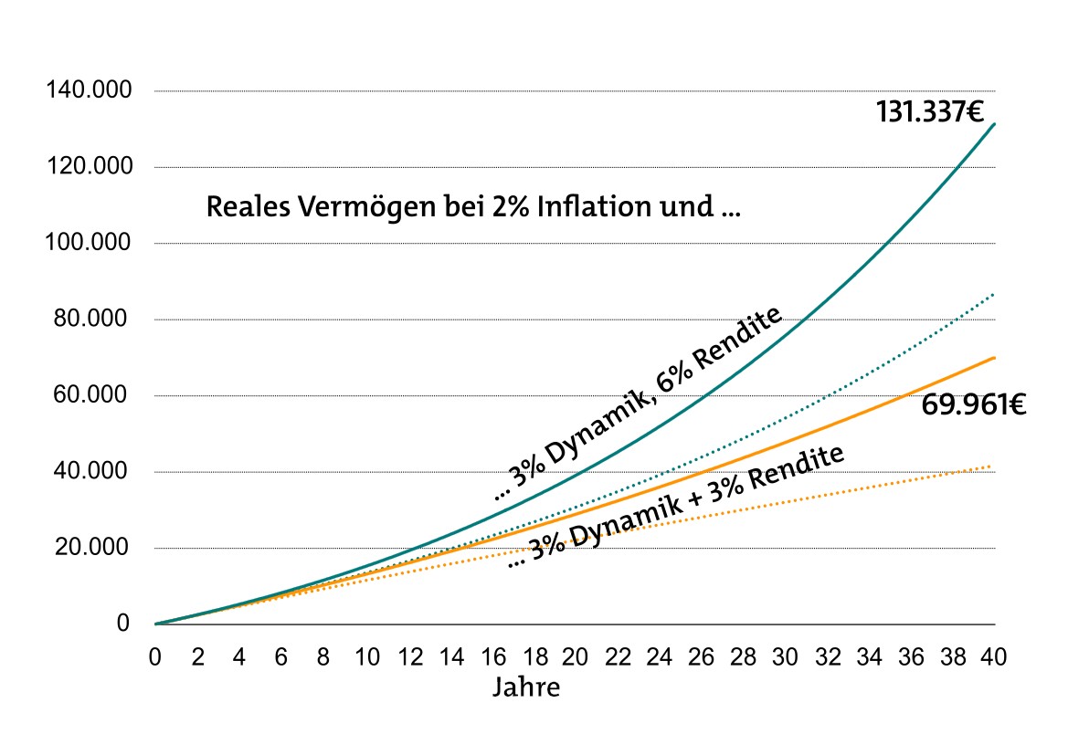 Ein Sparplan mit 3 Prozent Dynamik, 3 beziehungsweise 6 Prozent Rendite und 5 Prozent Inflation