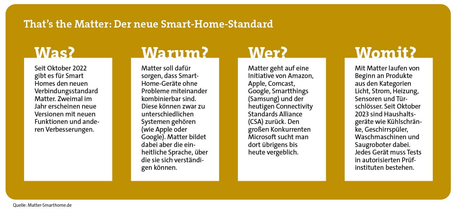 Wie viele seiner Kunden schon ein durchweg smartes Heim besitzen, kann Makler Schamberger nicht sagen. „Aber oft beginnt es mit einer Wärmepumpe und der angeschlossenen Fußbodenheizung, die man über eine App steuern will“, sagt er. So fängt es dann an, und weitere Geräte können folgen. Immerhin gibt es mit Matter inzwischen einen Standard, durch den die Akteure miteinander in Kontakt treten können.