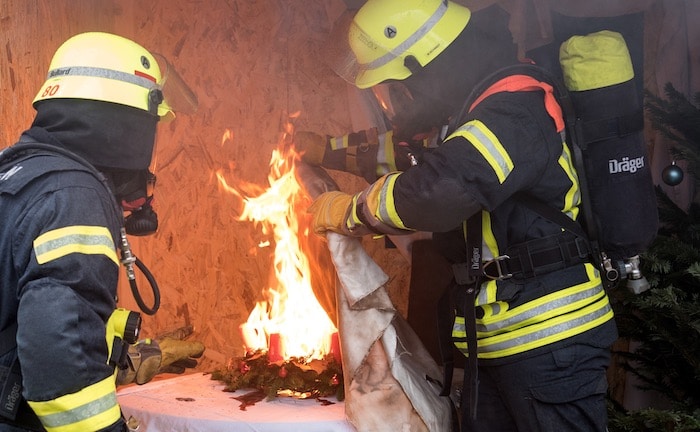 Feuerwehrleute löschen am 28. November 2019 in Kaltenkirchen während einer Vorführung einen brennenden Adventskranz mit Hilfe einer Löschdecke. Die Feuerwehr hat über die Gefahren zu Weihnachten und an Silvester informiert. Der Versicherungsverband GDV hat nun ebenfalls vor Feuerschäden durch unachtsames Verhalten gewarnt.