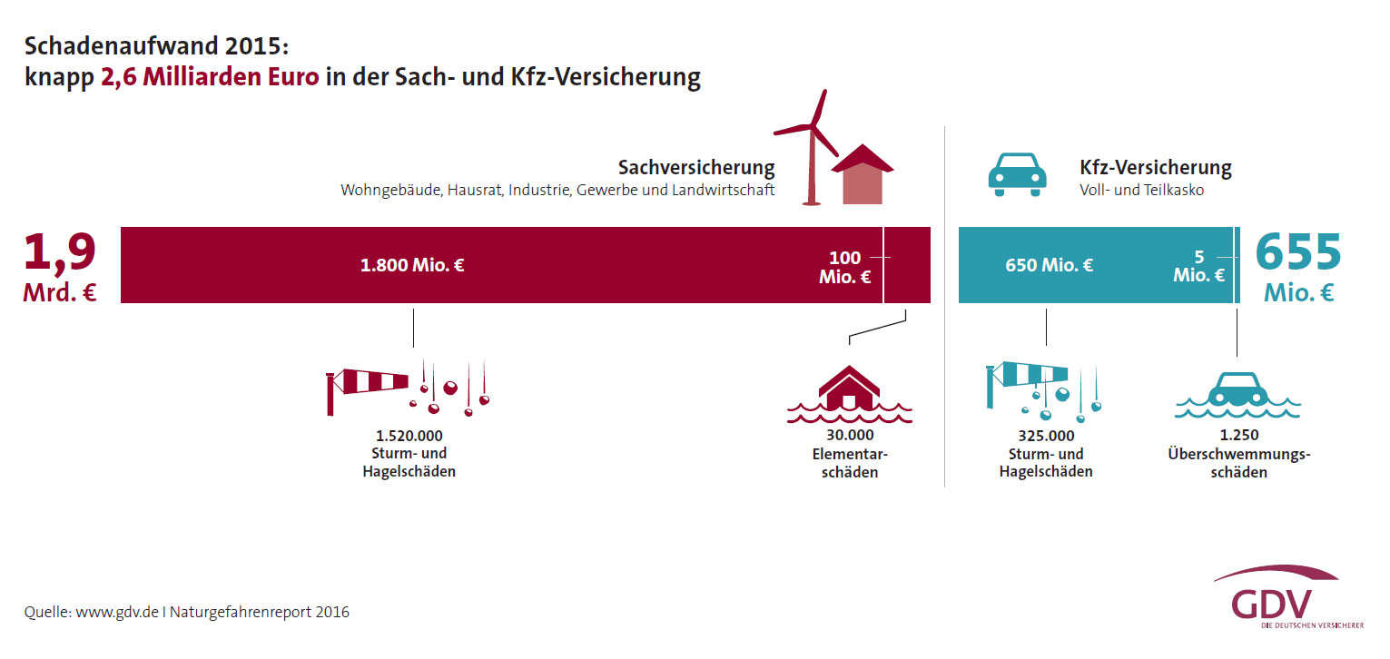 Stürme wirken sich vor allem in der Schadenbilanz der Sachversicherer aus, Hagelschäden dominieren bei den Kfz-Versicherern. Wintersturm „Niklas“ etwa hinterließ im März 2015 Gebäudeschäden in Höhe von 750 Millionen Euro. Damit verursachte nur ein einziger Sturm ein Drittel aller Schäden in der Schadenbilanz der Sachversicherer.