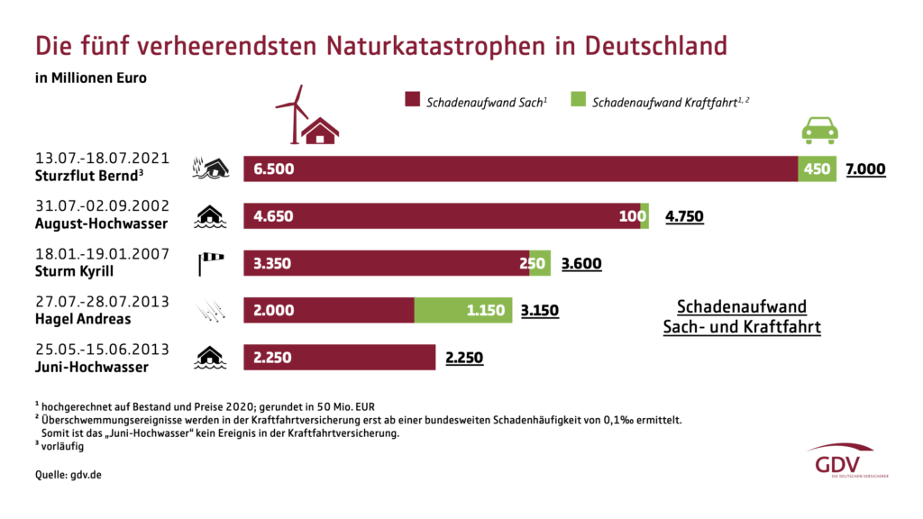 Denn: Die Schäden lägen sowohl über denen der Hochwasser im August 2002 (4,75 Milliarden Euro) und im Juni 2013 (2,25 Milliarden Euro) sowie denen des Orkans „Kyrill“ (3,6 Milliarden Euro). Laut dem GDV seien diese Werte „zum besseren Vergleich jeweils hochgerechnet auf aktuelle Versicherungsdichte und Preise“.